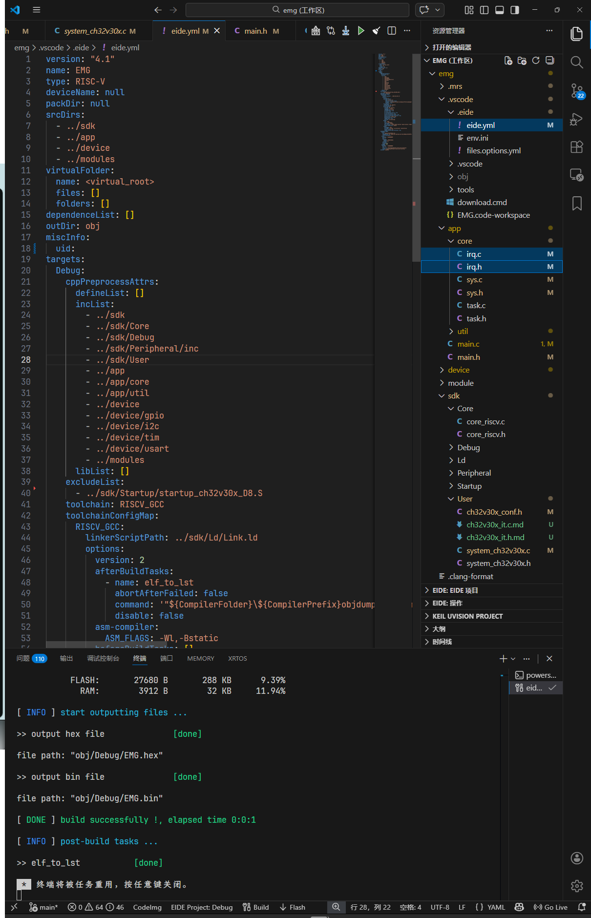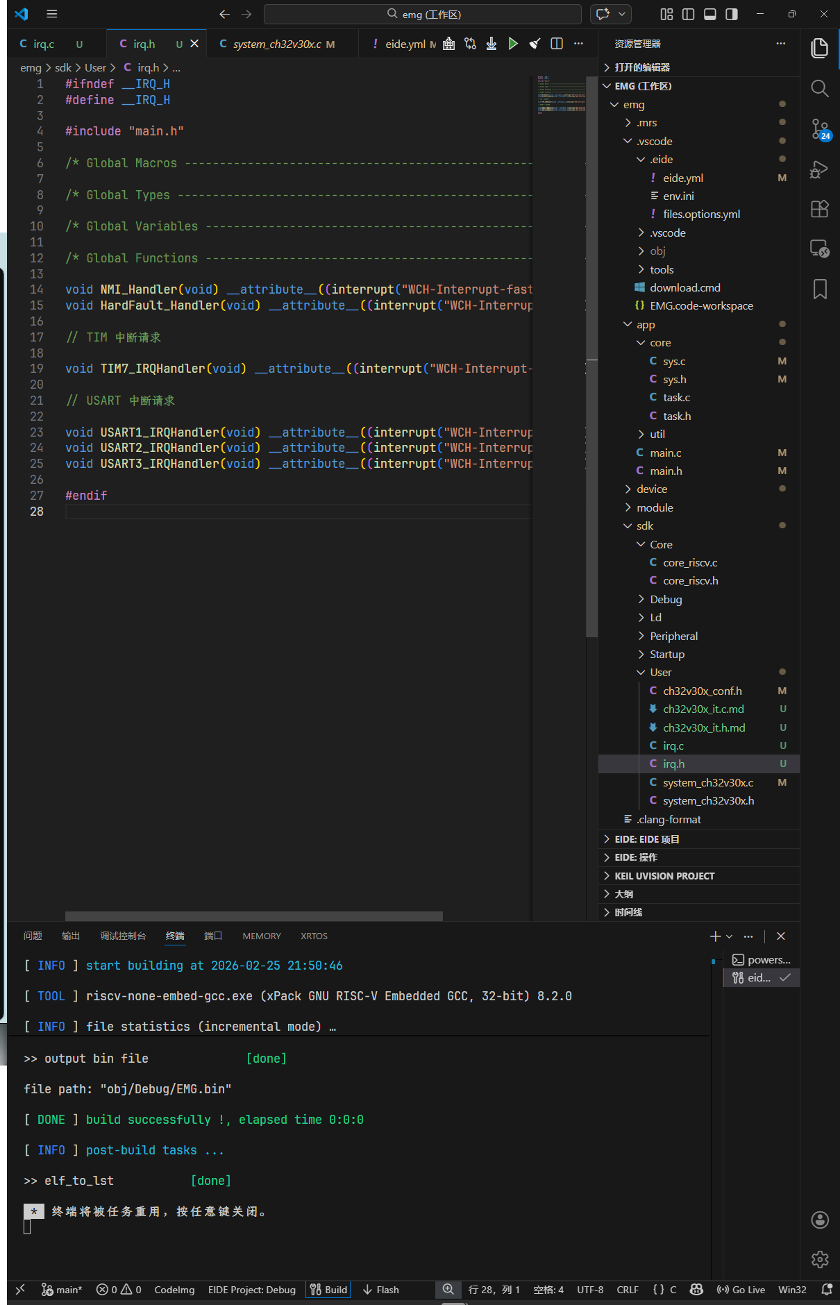 用 MounRiver Studio(MRS2)编译却没有此问题,但是 EIDE 用的 GCC 就是 MRS2 安装路径下的 GCC,按道理来说不应该出现问题。后来按照历史提问安装插件的 WCH 编译器和更改中断字段 attribute((interrupt("WCH-Interrupt-fast"))); 为 attribute((interrupt("machine"))); 也无效果。