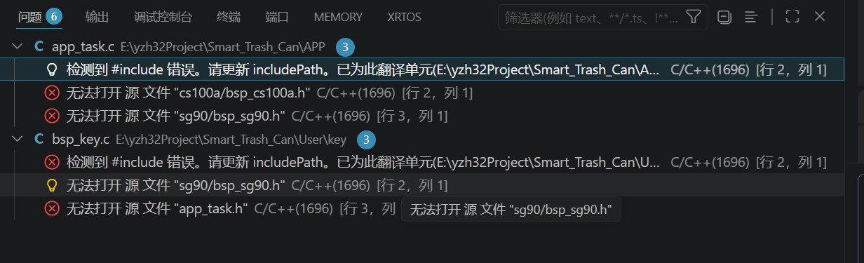 可以编译通过,也能下载到板子里,也能正常运行,编译也显示0errors,但是代码头文件下面会有红色波浪线提示检测到 #include 错误。请更新 includePath